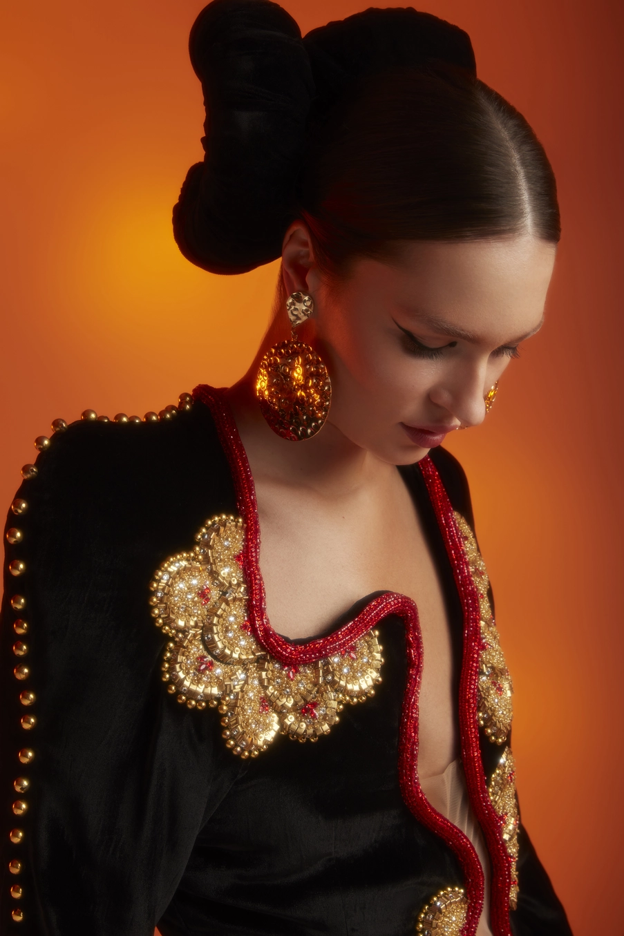 The intricate gold embroidery potrays a juxtaposition of the side profile of a Gajara bangle