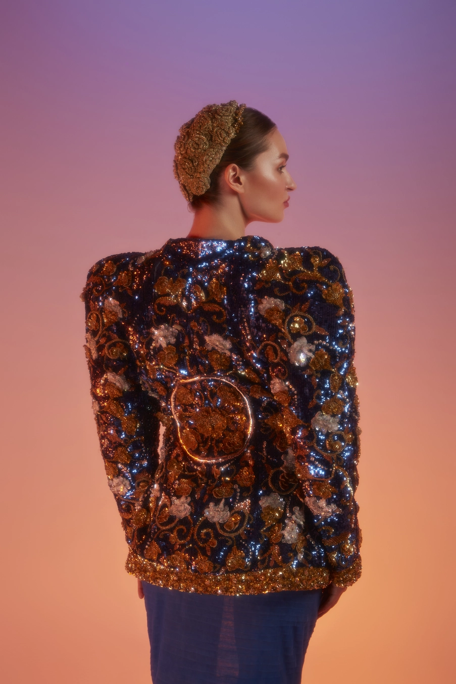 This jacket features a vibrant palette of rich blue, reflecting of lakh used in traditional jewellery. The intricate floral embroidery in paillettes and beads mimic the look of etched Meenakari in the shimmering blue lakh. The idea for it to look hand painted.