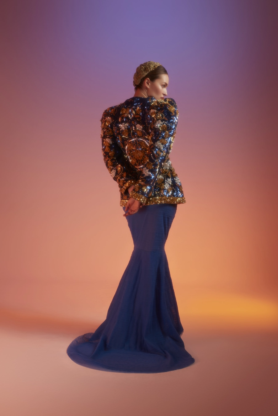 The jacket is finished in gold borders as traditionally prints, garments and even jewellery are all finished with a border either in a similar or complimentary colour. Something that is observed throughout the collection. The look is completed with a skirt in layers of silk tulle in a rich blue hue.